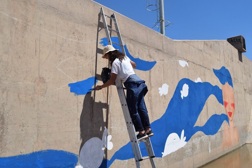 Siguiendo con las acciones que se llevaron adelante en las costas del río Cuarto, la artista local, Emilia Floriani, pintó un mural en uno de los paredones del azud sur, en homenaje a su madre, Alejandra Elstein, reconocida periodista de la ciudad.