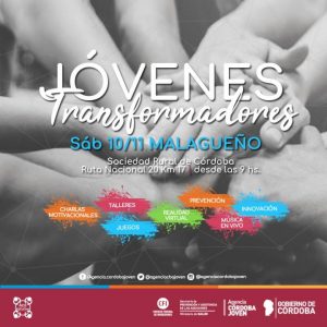 La jornada “Jóvenes Transformadores” tendrá su cuarta edición el próximo sábado 10 de noviembre en el predio de la Sociedad Rural de Córdoba, ubicado en Ruta Nacional 20 Km 17. Se trata de una actividad que busca fortalecer lazos entre sus participantes y debatir sobre temas como: la construcción colectiva, la implicancia de la tecnología en las relaciones sociales, el trabajo y las decisiones vocacionales, entre muchos otros. Forma parte del programa “Acá Se Nos Escucha” y está dirigida a jóvenes de entre 16 y 35 años que formen parte de instituciones educativas, ONG, iglesias, municipios, organismos del Estado o empresas, y también a público en general.